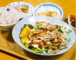 ・ご飯 ・味噌汁 ・チキンステーキ ・青野菜