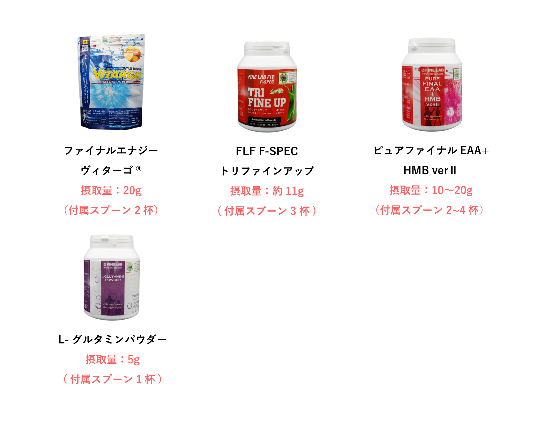 トレーニング直前に「ファイナルエナジーヴィターゴ®」+「ピュアファイナルEAA+HMB ver2」の補給がお勧めです。