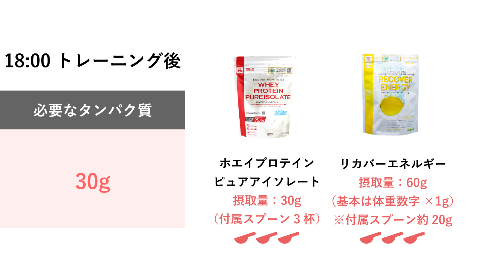 トレーニング直後に、「ホエイプロテインピュアアイソレート」と「リカバーエネルギー」の組み合わせがお勧めです。